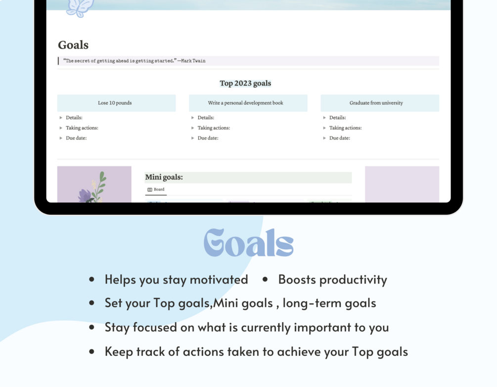 You will be able to increase your productivity, organize your life, track your progress, achieve your goals, and much more with this well-organized template.